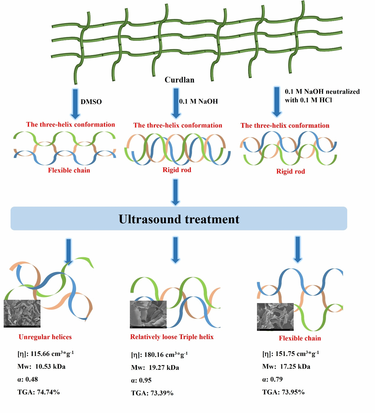 该研究探讨了超声波处理对可得然胶在三种不同溶剂(0.1 M NaOH、DMSO和0.1 M碱溶酸中和(AN)中的大分子行为、链构象和流变特性的影响。研究表明,可得然胶在DMSO中优先溶解并更易受到超声波降解,从而提高了其水溶性;超声波处理后,DMSO中的可得然胶构象从柔性链转变为不规则卷曲,而在其他两种溶剂中其三螺旋构象没有显著变化,这表明柔性链的可得然胶比刚性棒状结构更易受到超声波降解;超声波处理可降低可得然胶的稳态流变特性和动态粘弹性,为可得然胶在不同溶剂中的超声波改性提供理论依据,拓宽其在食品工业和生物医学领域的潜在应用。