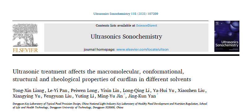 2025年2月24日,2022级食品质量与安全专业本科生梁桐欣以第一作者在国际学术期刊《Ultrasonics Sonochemistry》(中科院1区,影响因子8.7) 上发表题为“Ultrasonic treatment affects the macromolecular, conformational, structural and rheological properties of curdlan in different solvents”的研究性文章,2022级食品质量与安全专业本科生潘乐怡为第二作者,金明玉博士和闫景坤教授为通讯作者。