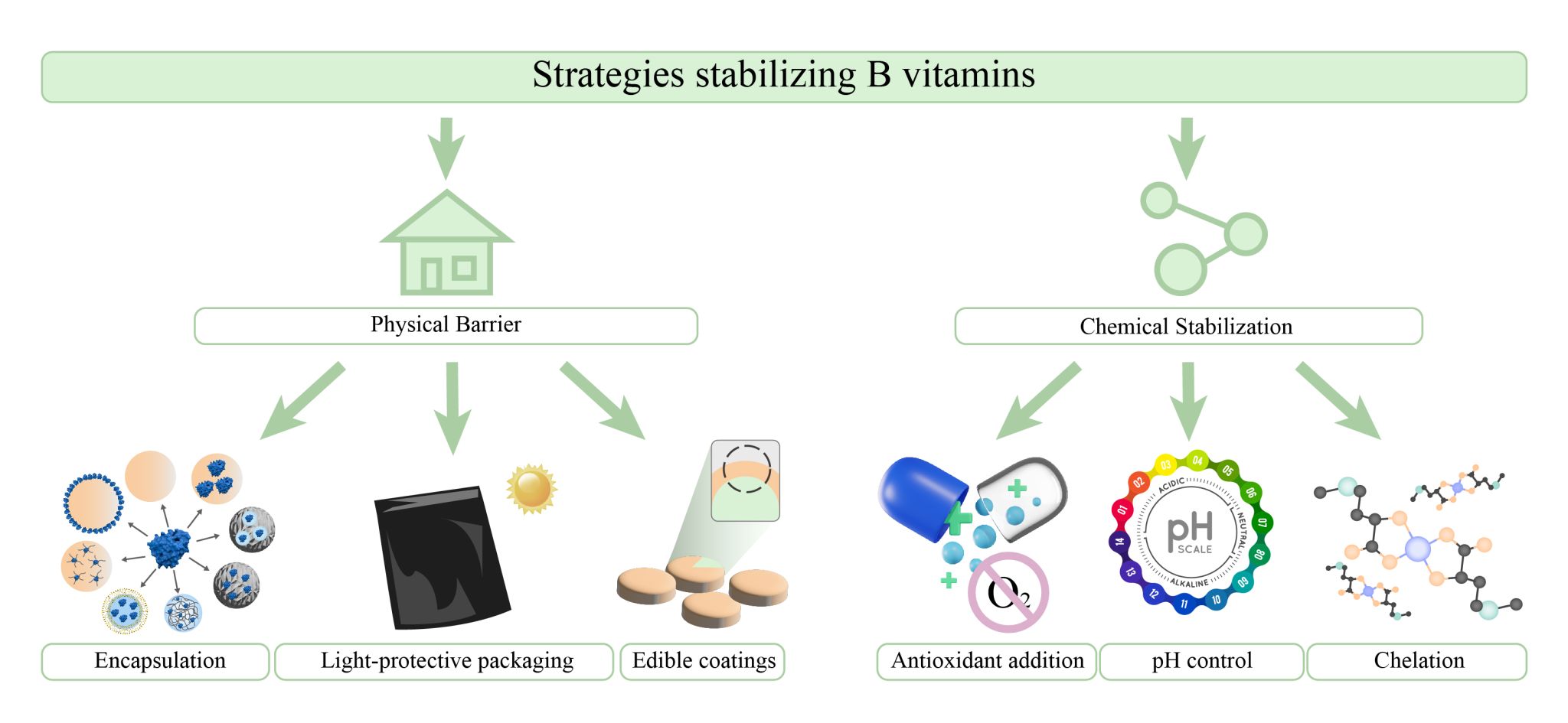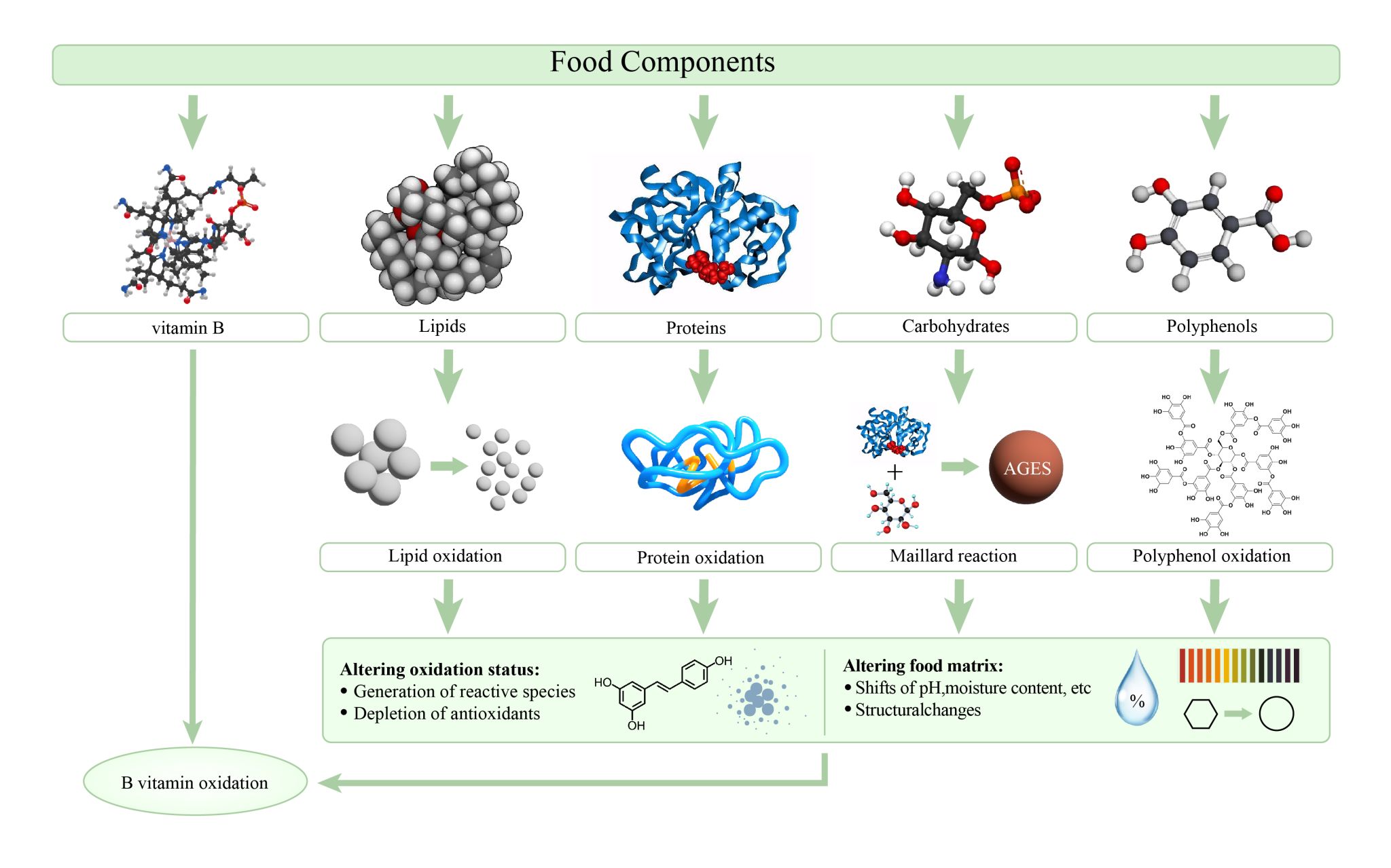 B族维生素是人体必需的微量营养素,在多种生化反应中发挥着关键作用,然而在食品加工和储存过程中,其在食品体系中的稳定性却受到氧化作用的显著影响。本综述系统探讨了B族维生素氧化与其他食品成分之间的复杂相互作用,特别关注脂质氧化、蛋白质氧化、美拉德反应和多酚氧化对B族维生素稳定性的潜在影响。文章系统分析了八种B族维生素的氧化机制及其在不同氧化条件下的特异敏感性。文中还重点讨论了食品基质效应,包括食品体系氧化状态的变化及基质属性的改变对B族维生素稳定性的影响,从化学和物理两个角度阐述了B族维生素与其他食品组分之间的相互作用,为理解这些相互作用如何影响维生素的保留与生物利用度提供了新见解。文章还总结了近年来在理解这些复杂关系方面的最新进展,以及食品体系中维生素保护的新兴策略。