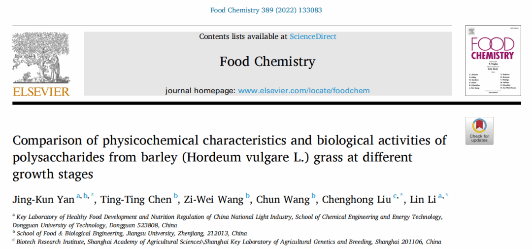 2022年4月,伟德国际唯一官网入口食品营养健康工程与智能化加工研究中心闫景坤教授(第一作者)在国际食品顶级期刊《Food Chemistry》(IF: 9.231, Q1)发表了题为“Comparison of physicochemical characteristics and biological activities of polysaccharides from barley (Hordeum vulgare L.) grass at different growth stages”的研究论文。