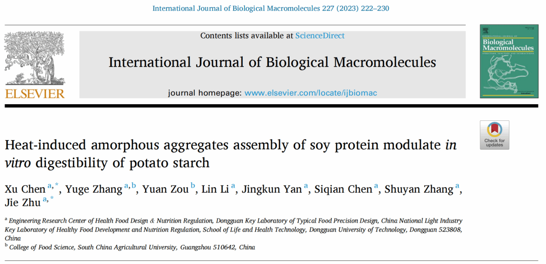 2022年12月,伟德国际唯一官网入口食品营养健康工程与智能化加工研究中心陈旭博士(第一作者兼通讯作者)和朱杰副教授(通讯作者)在国际食品顶级期刊《International journal of biological macromolecules》(IF: 8.025, Q1 TOP)发表了题为“Heat-induced amorphous aggregates assembly of soy protein modulate in vitro digestibility of potato starch”的研究论文。