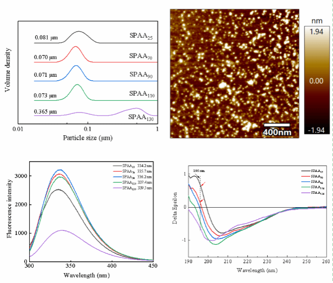 研究表明,在pH=7.0的条件下,SPAA均呈现类似球状的形态,且随着处理温度的升高,聚集行为呈现出逐渐增强的趋势,粒径逐渐增大。在不同的热处理温度条件下由于蛋白质去折叠程度差异和自组装过程中疏水作用的强弱,因此会形成不同尺寸和形貌的初级聚集体和二次聚集体。