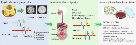西番莲又称百香果,是一种深受消费者喜爱的水果,其不仅具有独特的风味,还具有较高的营养价值。然而,在西番莲果汁的加工中会产生许多副产物,如果皮、种子和果渣等。这些副产物往往会被作为废物丢弃或低值化利用,从而造成了生物资源浪费。果胶多糖是西番莲果皮中最重要的功能性成分之一。本研究有效地利用了西番莲果皮,研究了西番莲果皮果胶多糖的体外胃肠道消化和粪便发酵特性,以及对肠道微生物多样性和代谢产物的影响。研究成果为西番莲果皮的高值化利用提供新思路。