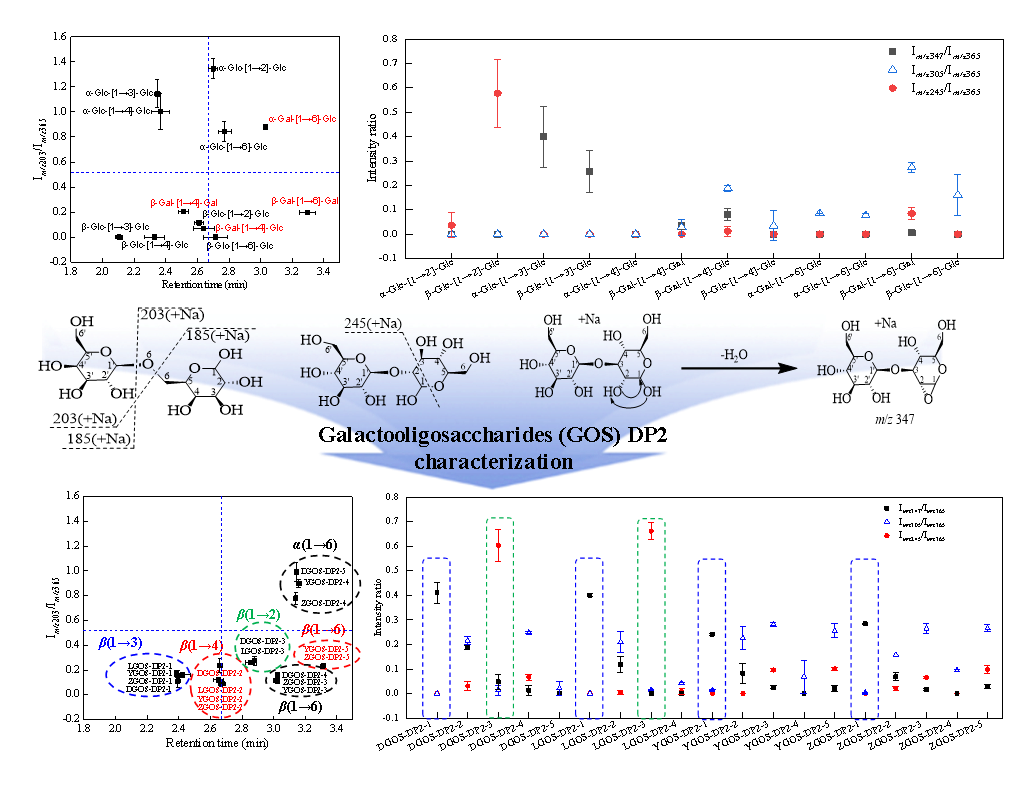 低聚半乳糖(Galactooligosaccharides, GOS)是一类重要的益生元,其功能与其结构密切相关。然而,由于单糖组成和糖苷键的不同,GOS的组成复杂且存在多种异构体,这对GOS各组分的表征提出了挑战。本研究基于液相色谱串联质谱分析方法,提出了一种将亲水相互作用色谱保留时间和串联质谱裂解规律相结合的策略来鉴定GOS中二糖糖苷键的α/β构型和糖苷键的连接位置。本研究建立的方法可用于高活性GOS产品的开发和质量控制。