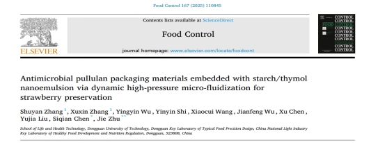 2024年8月31日,公司朱杰教授团队于国际食品顶级期刊《Food Control》(中科院一区Top期刊)在线发表题为“Antimicrobial pullulan packaging materials embedded with starch/thymol nanoemulsion via dynamic high-pressure micro-fluidization for strawberry preservation”的研究性文章。张书艳实验员为第一作者,硕士研究生张旭鑫为共同第一作者,朱杰教授为通讯作者。