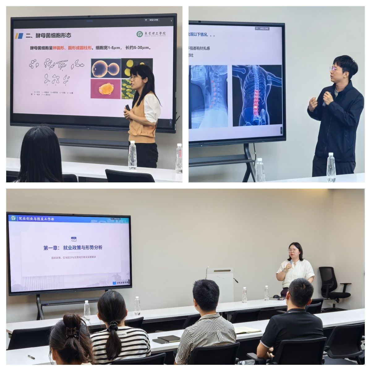 试讲环节中,刘晓珍、张昕、杨梅青三位教师依次登台授课,为与会者展示了各具特色、质量过硬的教学课程。刘晓珍以酵母菌为主题,系统梳理其形态、生理特性及应用场景,授课流畅自如,讲解深入浅出;张昕创新采用3D模型辅助教学,将抽象的脊椎颈椎结构直观呈现,有效帮助听众快速理解;杨梅青主讲就业指导课,结合东莞本地产业发展实际与最新热点,针对性讲解就业政策、求职技巧及职业规划要点,内容实用、贴合需求